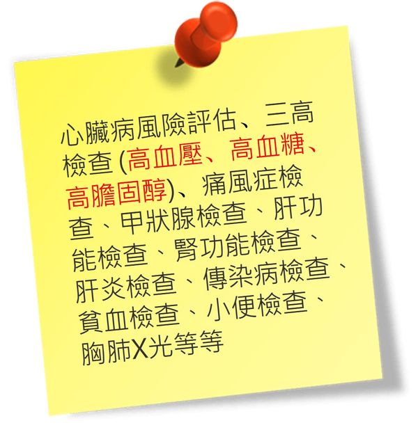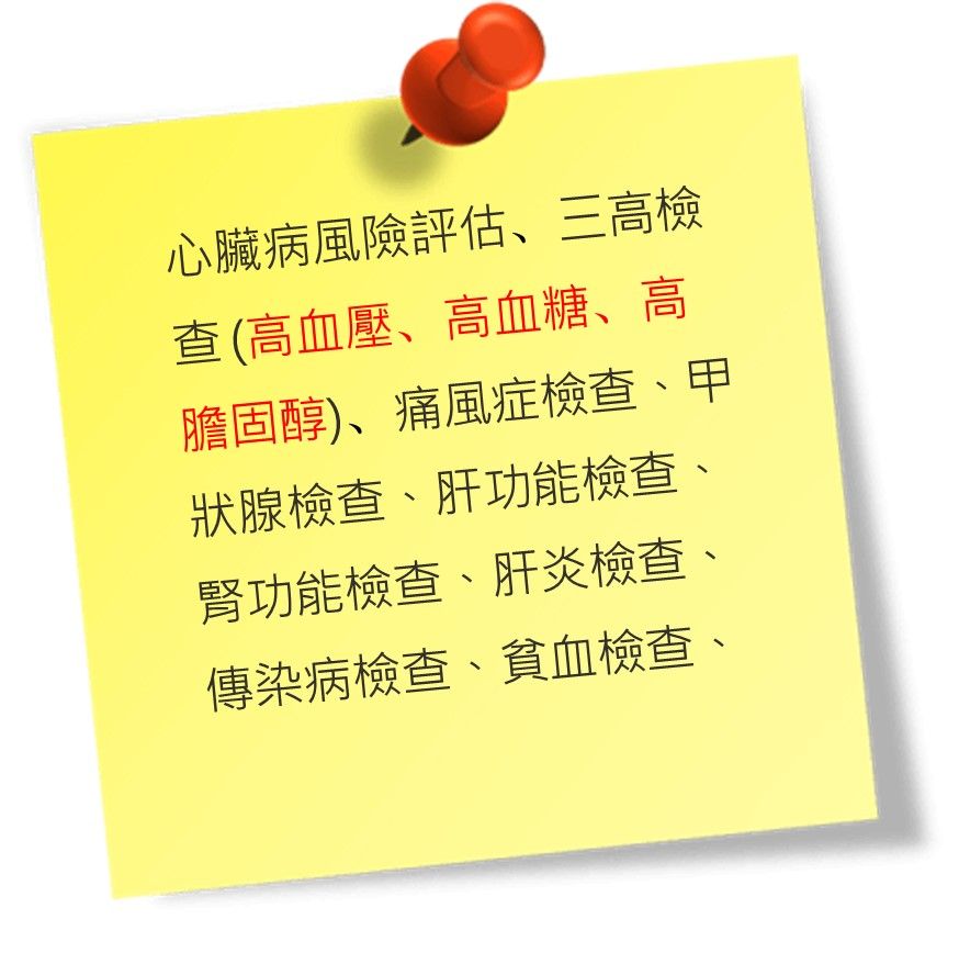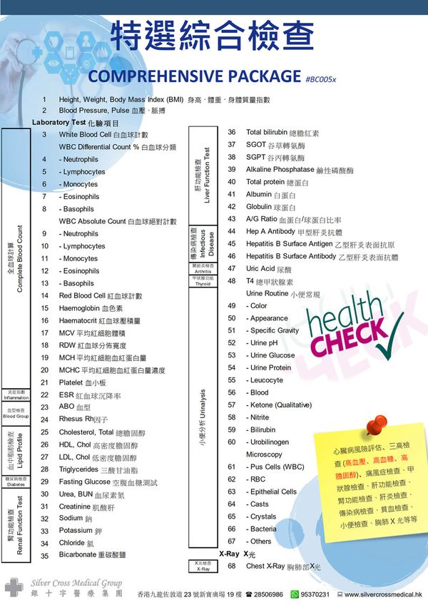 此檢查適用於成年男女, 綜合檢查包括血脂檢查、糖尿病檢查、腎功能檢查、肝功能檢查、痛風檢查、甲狀腺功能、傳染病檢查、貧血檢查、血型檢查、小便分析和肺部X光