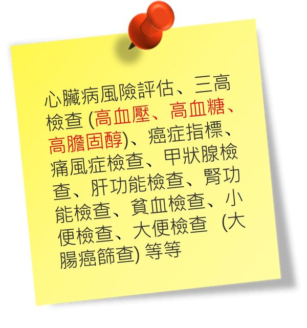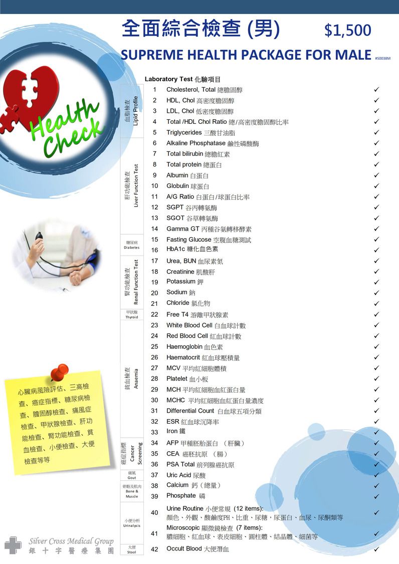 此檢查適用於成年男士, 全面綜合檢查包括血脂檢查、糖尿病檢查、腎功能檢查、肝功能檢查、痛風檢查、甲狀腺功能、癌症篩檢、貧血檢查、大便潛血(大腸癌篩檢)和小便分析