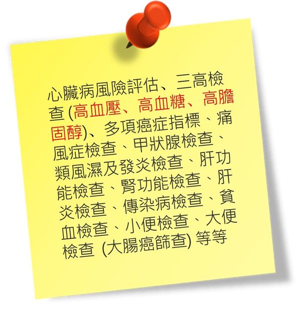 此檢查適用於成年男士, 優越綜合檢查包括血脂檢查、糖尿病檢查、腎功能檢查、肝功能檢查、痛風檢查、類風濕及發炎檢查、甲狀腺功能、多項癌症篩檢、傳染病檢查、貧血檢查、大便潛血(大腸癌篩檢)、大便常規和小便常規