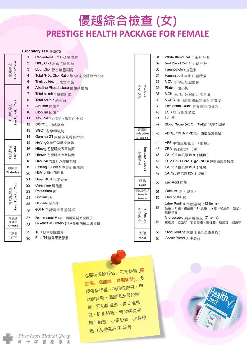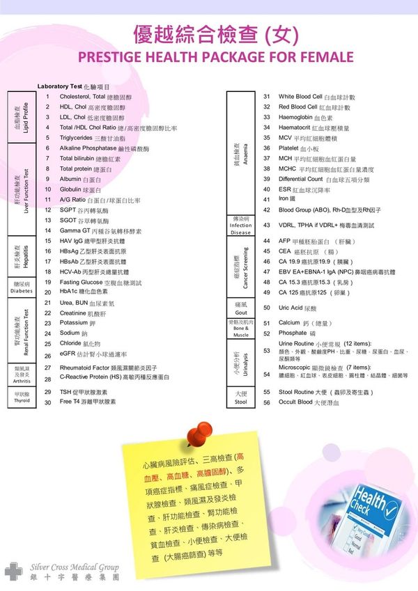 此檢查適用於成年女士, 優越綜合檢查包括血脂檢查、糖尿病檢查、腎功能檢查、肝功能檢查、痛風檢查、類風濕及發炎檢查、甲狀腺功能、多項癌症篩檢、傳染病檢查、貧血檢查、大便潛血(大腸癌篩檢)、大便常規和小便常規。