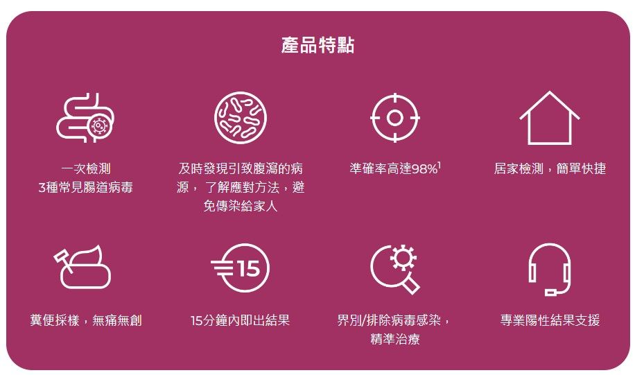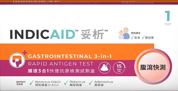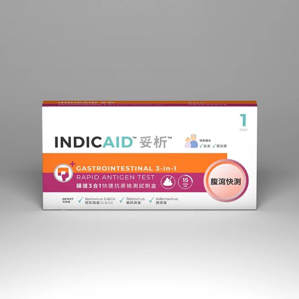 諾如病毒/輪狀病毒/腺病毒為引致病毒性腸胃炎的主要病毒。 INDICAID妥析腸道3合1快速抗原檢測試劑盒能快速簡單測出3種腸道病毒,及時發現引致腸胃炎的病源,減低傳染和及早對症下藥。
